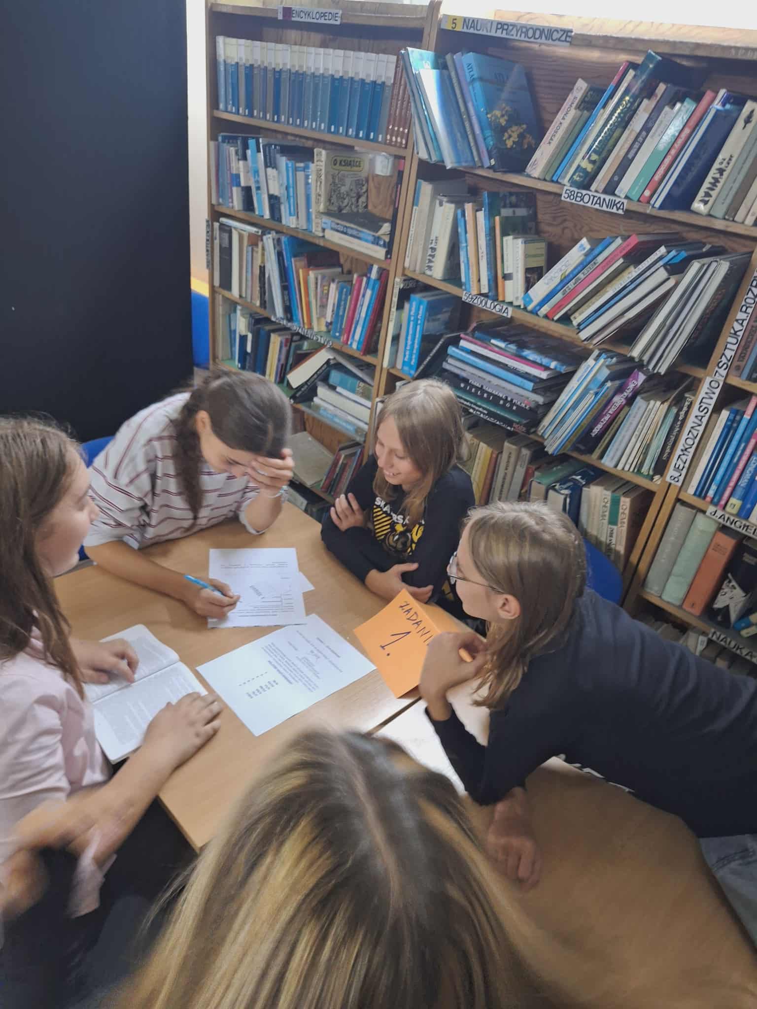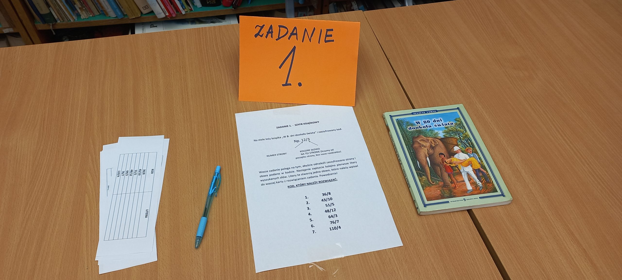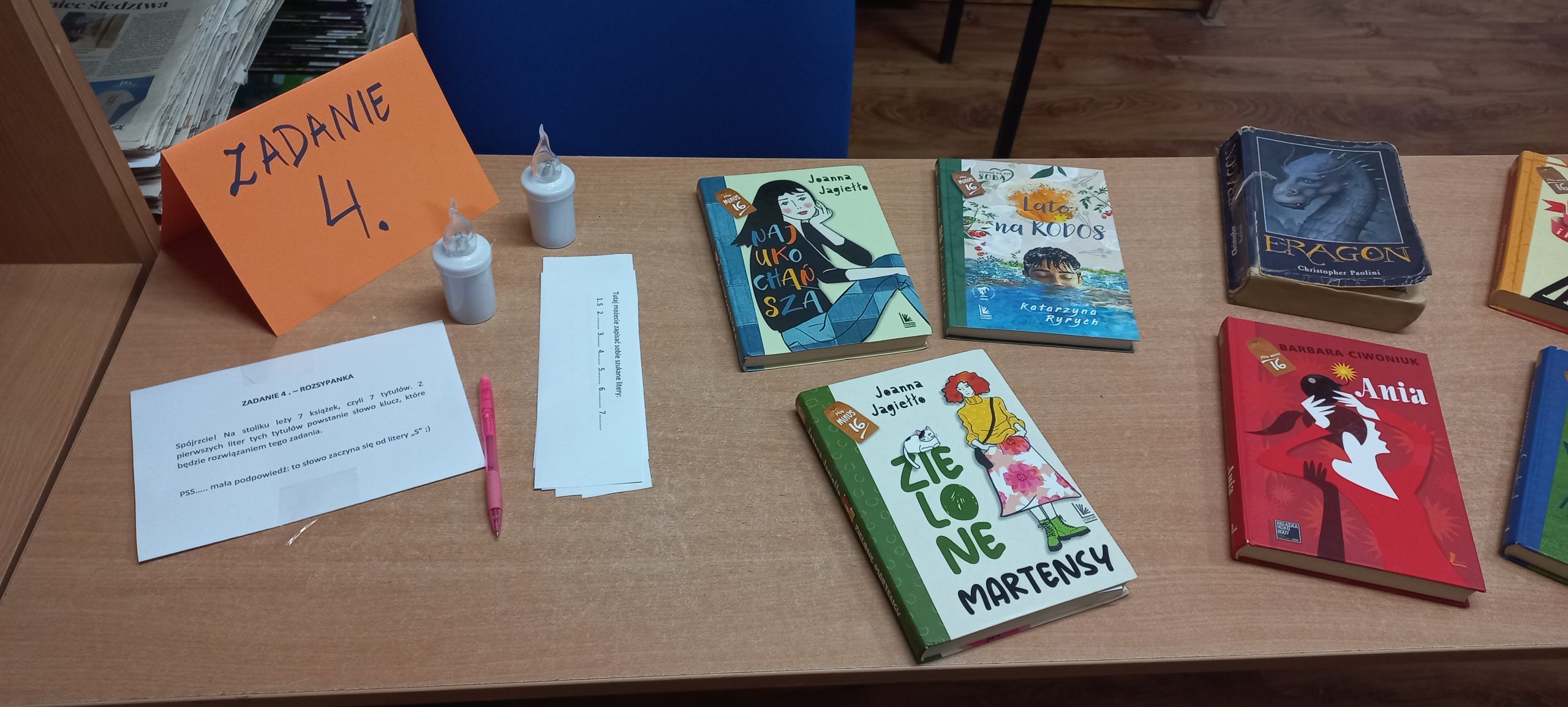 Akcja podobała się uczniom. Na początku odczytaliśmy głośno książkę "Promyki" Kobiego Yamady, następnie młodzież przeniosła się do podróżniczego escaperoomu, gdzie musiała wykazać się sprytem, mądrością i znajomością lektur. W bibliotece czekało na nich 5 stacji zadaniowych, każde zadanie miało w rozwiązaniu słowo, które na końcu tworzyło hasło. Zadania były następujące: ZADANIE 1. - SZYFR KSIĄŻKOWY (Na stole leżała książka „W 80 dni dookoła świata” i zaszyfrowany kod). ZADANIE 2. – POSZUKIWANIA SYMBOLI (W misce z kaszą ukryte były różne mini przedmioty, symbole. Nawiązywały one do tytułu pewnej książki. Co to za tytuł?). ZADANIE 3. – W POSZUKIWANIU TYTUŁU (uczniowie musieli, na podstawie zagadki, odnaleźć na regale tytuł książki). ZADANIE 4 . – ROZSYPANKA (Na stoliku leżało 7 książek. Z pierwszych liter tych tytułów powstało słowo klucz, które było rozwiązaniem tego zadania). ZADANIE 5. – REGAŁOWE POSZUKIWANIA (Między regałami ukryte były 2 rebusy. Rozwiązanie ich dało słowo klucz).