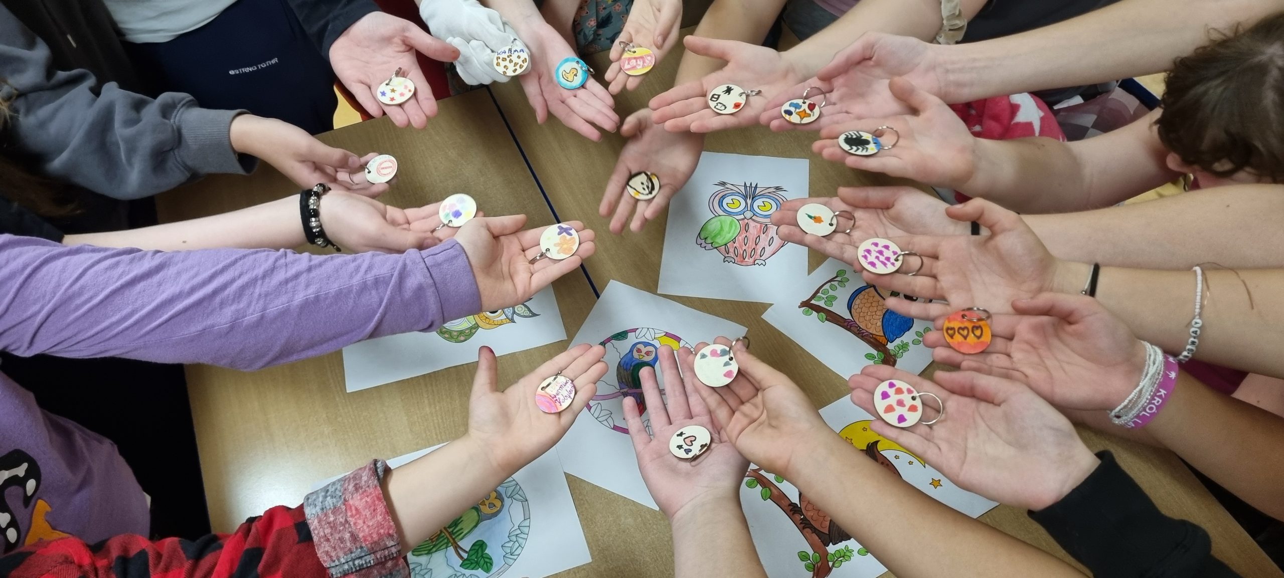 Po tej emocjonującej części wieczoru odbyły się zajęcia z nietypową książką, czyli teatrzykiem kamishibai. Uczniowie wysłuchali wartościowej bajki o Brzydkim kaczątku, która uczy akceptacji inności, wiary w siebie, cierpliwości oraz nieosądzania innych po pozorach. Uczy również tego, iż każdy jest wyjątkowy i że warto być dobrym dla innych, nawet jeśli na początku wydaje się dziwny lub gorszy. Specjalnie na tegoroczną noc Joanna Mueller napisała wiersz pt. „Jest taki portal”, który zachęcał do korzystania z biblioteki i czytania książek. Oto jego fragment: „Dzięki książce fantazja jeszcze nie zginęła, póki żyjesz, czytaj – no, bierz się do dzieła!”. Po wysłuchaniu wiersza odbyły się warsztaty plastyczne, na których każdy ozdobił swój spersonalizowany breloczek oraz barwnie pomalował mandalę z wizerunkiem sowy.